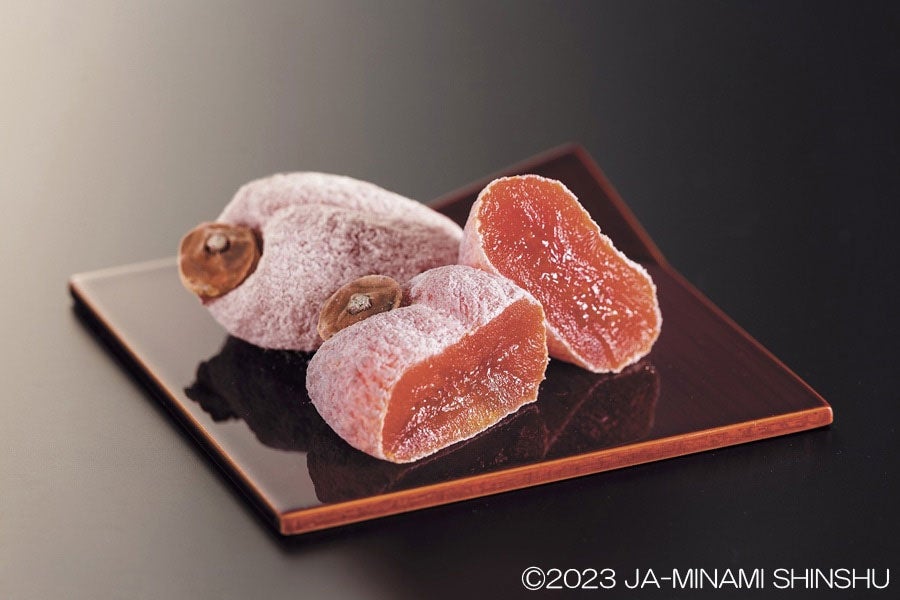 「市田柿」というのは現在の下伊那郡高森町の市田地域で栽培されていたことから名前のついた渋柿の品種名です。その栽培の歴史は500年以上といわれ、これを干し柿にしたものも「市田柿」と呼びます。干し柿は一口大で食べやすく、鮮やかなあめ色の果肉をきめ細かな白い粉が覆い、もっちりとした食感と上品な甘味があるのが特徴。自然の甘さをもつドライフルーツであると同時に、高級和菓子にも位置づけられています。