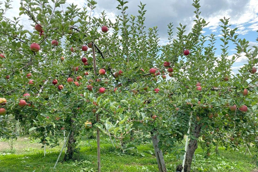 りんご畑は山間部から平野部まで管内の全域にわたっており、全国的に人気のある「ふじ」や「つがる」が主流ですが、長野県オリジナル品種の「秋映」「シナノゴールド」「シナノスイート」も多く栽培されています。
