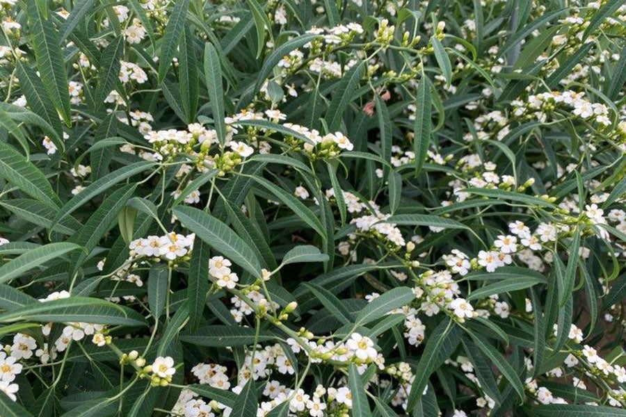 細い枝はゆるやかな弧を描き、葉は細長く先端が尖っています。直径約1.5cmほどの小さな花は、葉のわきに数個ずつ集まって、こぼれ落ちるように上を向いて咲き乱れます。