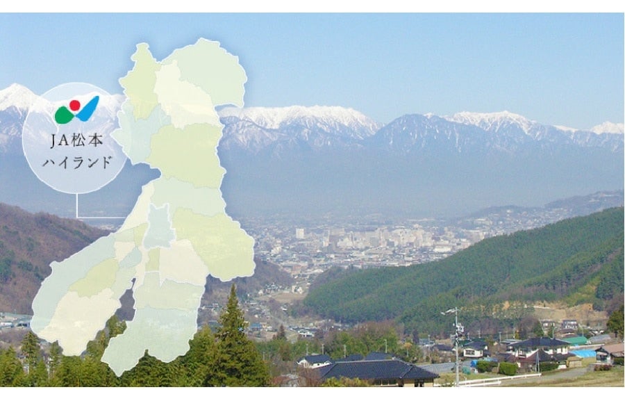 JA松本ハイランドは長野県のほぼ真ん中、北アルプスのふもと標高600m〜1000mの高原に位置します。年間の降水量は1,011mm、年平均気温は、11.2度と、さわやかな気候に恵まれた豊かな大地です。
