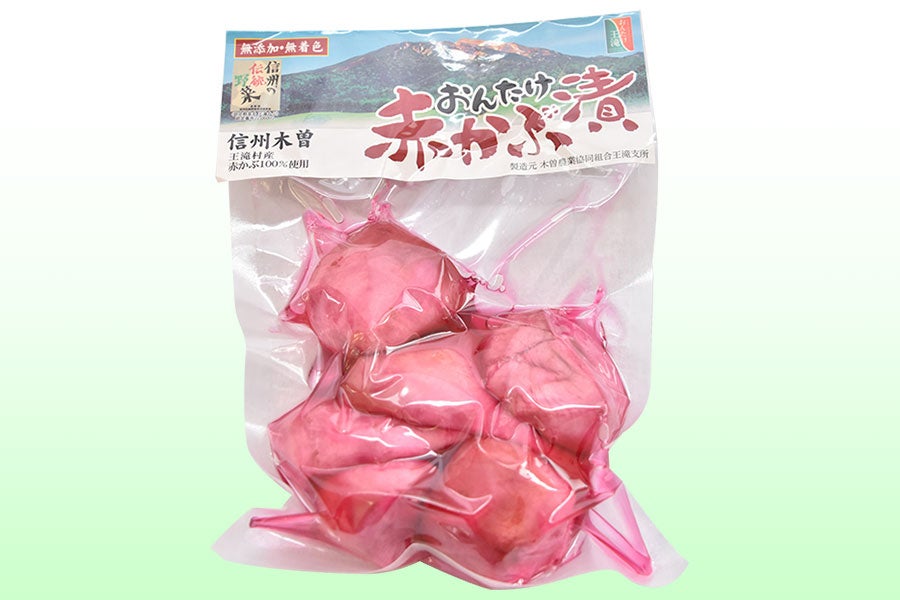 赤かぶは霊峰木曽御嶽山麓高冷地の特産で特に王滝村で栽培された「王滝かぶ」は約300年の歴史があり「信州の伝統野菜」にも認定されています。鮮やかな赤色は、着色料を一切使用せず赤かぶ本来の色で食酢、塩、砂糖のみで漬け上げました。