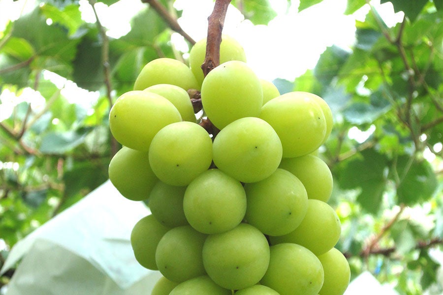 長野市若穂町は、内陸性気候で雨が少なく(4〜10月のぶどう生育期間中の雨量は600〜700mm)、日較差(一日の気温の高低差)が大きいという、果実の栽培の条件を備えていますので必然的に甘くて美味しいぶどうが出来るのです。シャインマスカットは濃厚な甘みと芳醇で高貴な香りが口いっぱいに広がり食べた人をやみつきします。