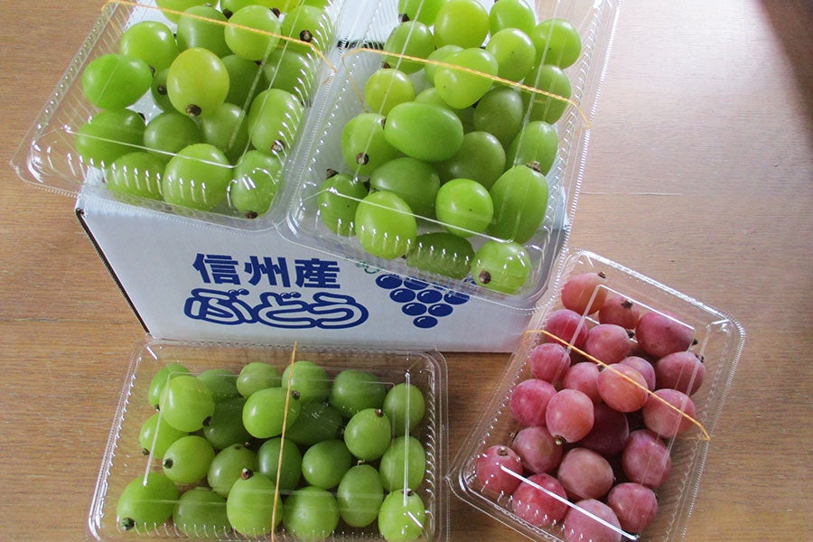 シャインマスカット3パックとクイーンニーナ1パックをセットでお届けします。