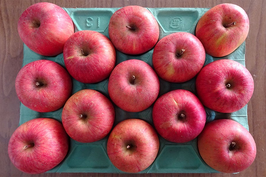 サンふじの蜜は、人工的なものではなく、光合成によって作られるソルビトールという糖質アルコールです。ハチミツ色をしているので「蜜」と呼ばれています。蜜は収穫後少しずつ果肉に吸収され、12月下旬から1月にかけて見えなくなります。