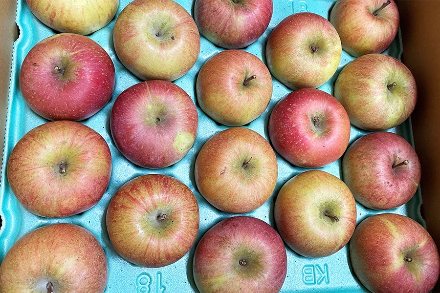 農薬の使用に気を遣い栽培しているため、一般的な家庭用りんごより見た目の劣る品が入ります。