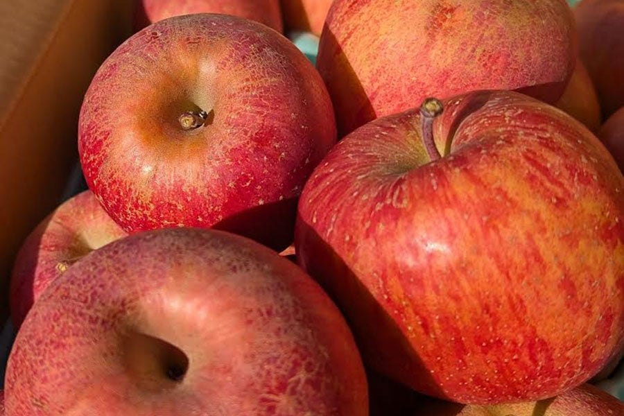 「国光」と「デリシャス」の交配品種で、日本を代表するりんごです。甘味が強くて果汁が多く、蜜も入りやすい貯蔵性に優れたりんごです。「サンふじ」は、太陽の光を充分に浴びて育つため、一段と濃厚な味わいがお楽しみいただけます。