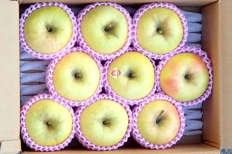群馬県の試験場で、「あかぎ」と「ふじ」から生まれたのが「ぐんま名月」です。黄色のりんごなのに蜜が入りやすい珍しいりんごです。