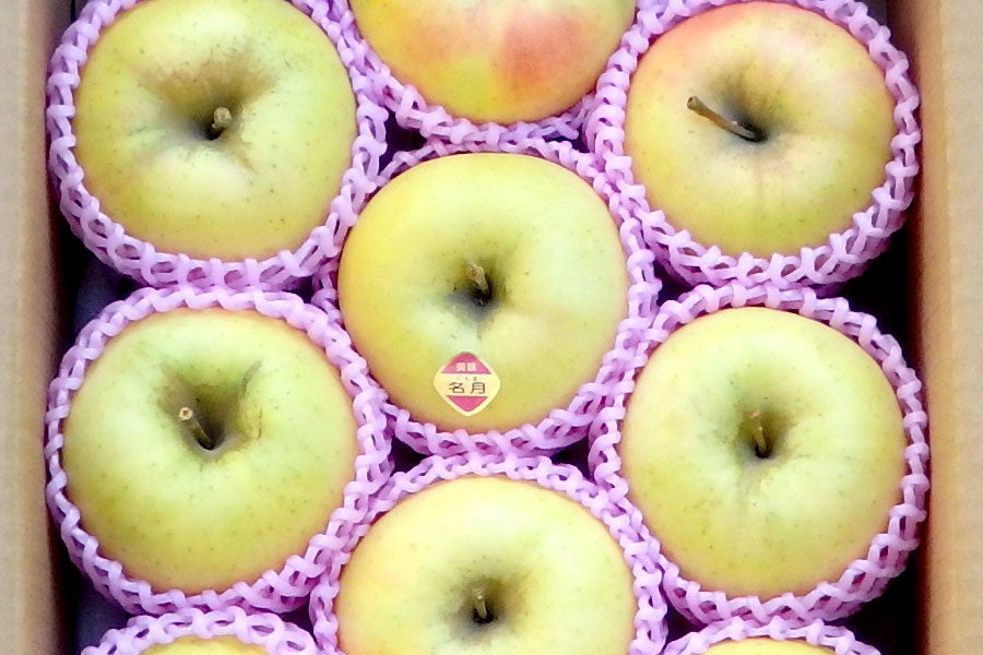 群馬県の試験場で、「あかぎ」と「ふじ」から生まれたのが「ぐんま名月」です。陽が当たった面が赤く色づくことがあります。酸味が少なくしっかりとした甘味から人気があります。黄色のりんごなのに蜜が入りやすい珍しいりんごです。