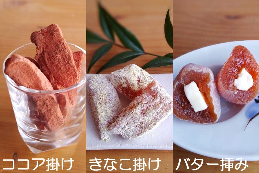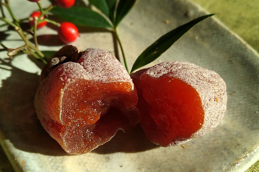 柿を干す時に一般的に行われる硫黄くん蒸をしていません。硫黄くん蒸をすることにより柿は鮮やかなオレンジ色を保ちカビが生えるのを抑えられますが、味や外観には違いがでます。無くん蒸の干し柿は非常にリスクが高いため生産量は極僅かです。
