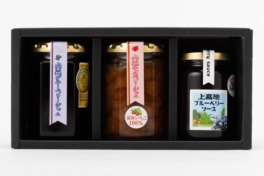 信州の果物にこだわり、旬にこだわり、製法(真空調理法)にこだわり、風味豊かに、果実感を残して仕上げた、ちょっと贅沢なフルーツジャム、フルーツソースの詰め合わせです。 【上高地夏秋いちごジャム】 JAあづみの農家さんが安曇野で丁寧に生産したすずあかねを100%使用した、爽やかな酸味と甘さが融合したジャムです。低糖度(約45度)で、きれいなピンク色のいちごの果実がそのまま残り、果実をかむとじゅわっとさわやかな酸味が口の中に広がります。 【上高地ブルーベリージャム】 2023年度モンドセレクション金賞受賞。上高地ブルーベリー園で収穫した、農薬:栽培期間中不使用の信州産ブルーベリーと、北海道産てんさい糖のみから作られた国産原料100%のちょっと贅沢なブルーベリージャムです。添加物・保存料は一切不使用。 真空調理法(※)により、ブルーベリーの新鮮さ・いろどり・味・香りをそのままに、果実感にこだわり、果実を潰さないよう丁寧に、丁寧に、仕上げました。低糖度(約40度)で、果実感ごろごろのプレザーブスタイルのジャムです。 ※真空調理法とは真空窯という特殊な窯を使用し、窯内部の気圧を下げることにより、沸点を60〜65℃にする調理法です。 通常のジャム作りでは、100℃で加工するようになるため、新鮮な果物のダメージを最小限に抑えることができます。 【上高地ブルーベリーソース】 素材にこだわり、真夏の最も甘い時期に収穫した信州産自家栽培完熟ブルーベリーをふんだんに使用し、製法(真空調理法)にこだわり、ブルーベリーの鮮度、風味と果実感をそのままに仕上げた、ちょっと贅沢なこだわりのフルーツソースです。真空窯を使い、低い沸点(60〜65℃)で調理しているため、ブルーベリーの新鮮さ、風味と果実感が損なわれず味わえます。健康を大切にした超低糖度(約30度)で、ブルーベリー本来の甘さ、美味しさを引き出しています。飲むヨーグルトや牛乳に入れて、ヨーグルトやアイスクリームにかけて、お召し上がりください。 【上高地ブルーベリー園】 上高地ブルーベリー園は、上高地のふもとに位置し、標高600mを超える松本平の日照時間が長く、降水量が少ない果物栽培に絶好の自然条件でブルーベリーを栽培しています。園内には約1,200本のブルーベリーがあり、有機肥料を使用し、ブルーベリー園を始めてから現在に至るまで、農薬:栽培期間中不使用にこだわりながら信州の澄んだ空気と水で育てたブルーベリーを丹精込めて一粒一粒手摘みしています。 上高地ブルーベリー園では、お客様や働く方の健康を守るため、ブルーベリーの生育期(芽吹きから落葉までの期間)、農園内では化学合成農薬を使っていません。園内の草取り等の管理は、知的障がい者施設の皆さんが、農薬を使わずに手作業で行っています。販売額の2割は、障がい者の皆さんの就労支援に充てられています。  名称:いちごジャム 原材料名:いちご(すずあかね:長野県安曇野産)、ビートグラニュー糖(北海道製造) 内容量:150g 賞味期限:製造日から16か月 保存方法:直射日光、高温多湿を避け常温保存してください 名称:ブルーベリージャム 原材料名:ブルーベリー(長野県産:自家栽培)、てんさい糖(北海道製造) 内容量:150g 賞味期限:製造日から16か月 保存方法:直射日光、高温多湿を避け常温保存してください 名称:ブルーベリーソース 原材料名:ブルーベリー(長野県産:自家栽培)、ビートグラニュー糖(北海道製造) 内容量:110g 賞味期限:製造日から16か月 保存方法:直射日光、高温多湿を避け常温保存してください