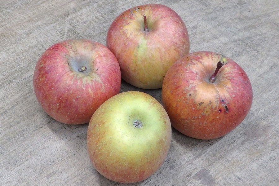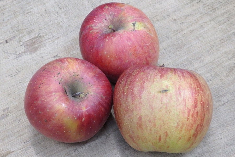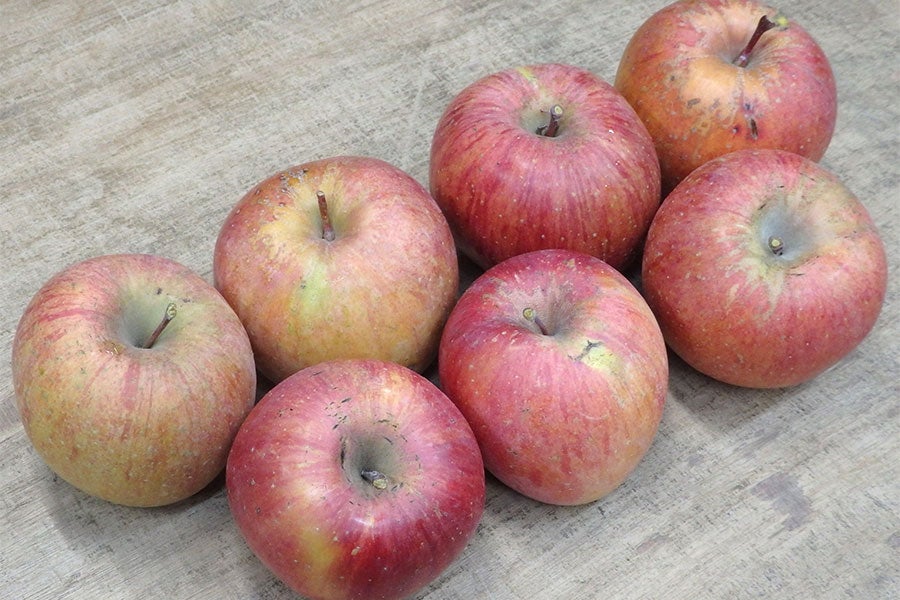 甘さと酸味の好バランス、シャキッとした歯触りに豊富な果汁が楽しめる、りんごの代表格。貯蔵性が高く、加熱しても煮崩れしにくい優れた品種ですが、個体差が目立ちやすく実ごとの味むらが大きいという特性もあります。
