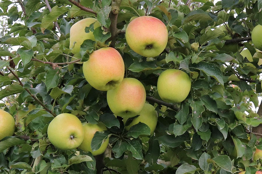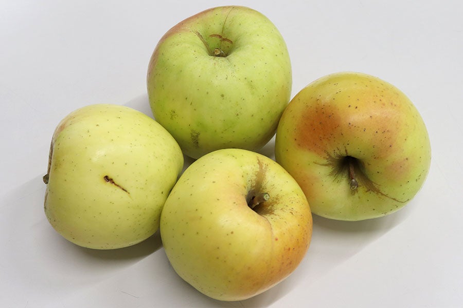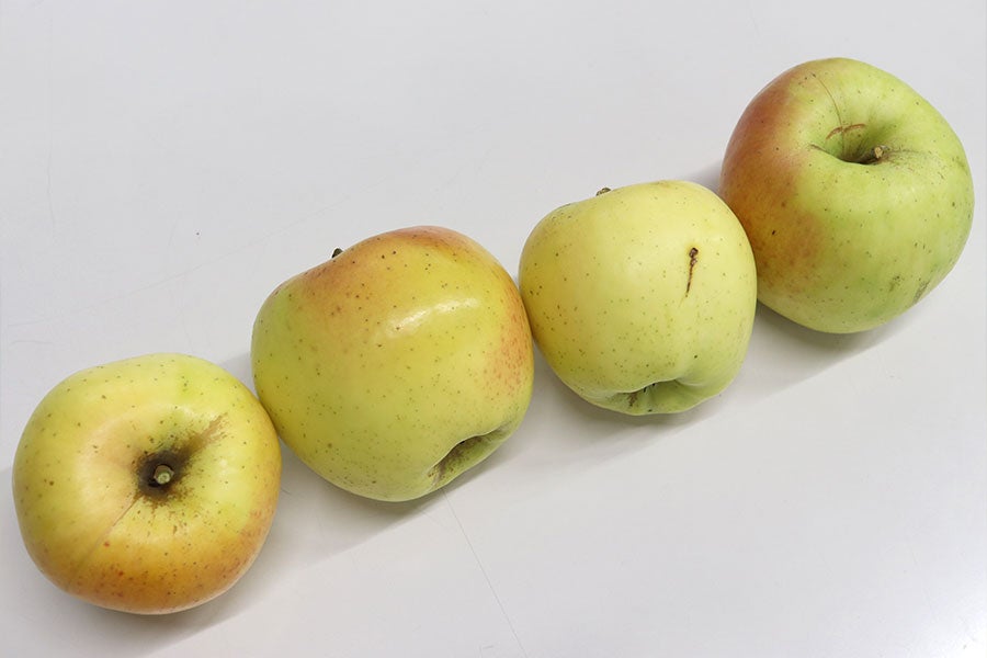 「ぐんま名月」は、「あかぎ」と「ふじ」を交雑して育成され、1991年(平成3年)に品種登録されました。黄色い品種ですが、陽があたった部分は果皮の一部がほんのりと赤く着色しているものが多く、表面の半分が赤く染まっているものもあります。味は甘味が強く、酸味は少なめ、香りがよくて果汁が豊富です。ぐんま名月は蜜が入りやすいのも特徴の1つです。