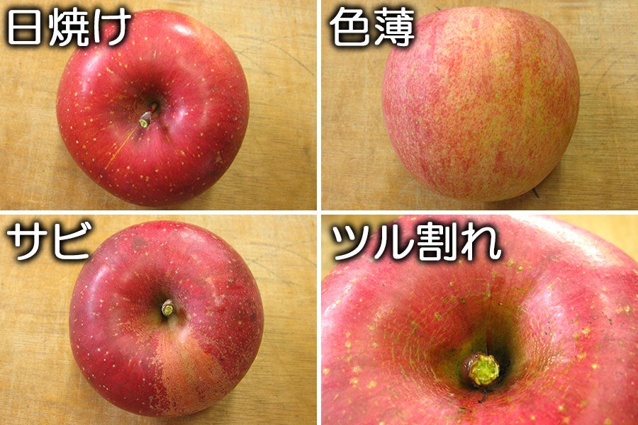 徳用は軽微な、サビ(果皮の茶色の変色)・変形・日焼け・色付きが薄い・ツル割れ・ヒビ割れ・傷などがあり、贈答用に選別する際に疑問を感じたりんごや、家庭用にするにはもったいないと感じたりんごを集めた品です。