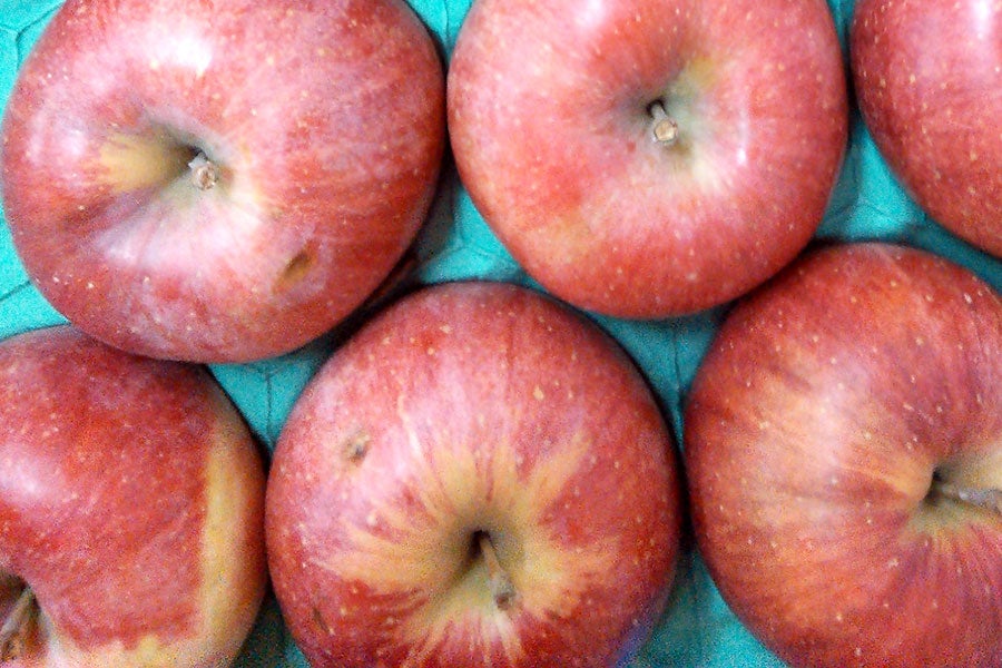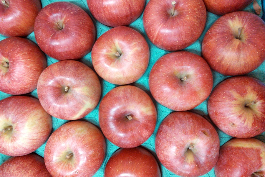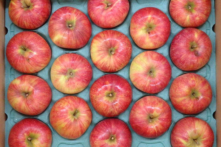 「シナノスイート」は長野県果樹試験場で育成した、「ふじ」と「つがる」の交配品種。果汁が多く、その名前のとおりほどよい甘味と少ない酸味が特徴です。