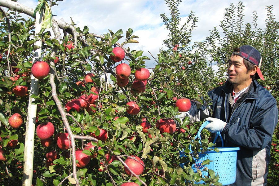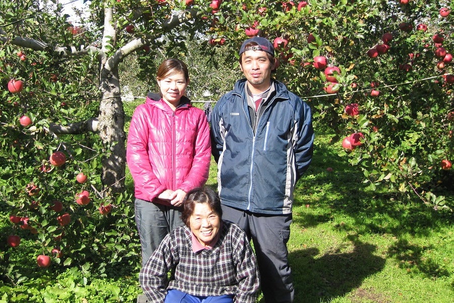 丸茂ファームがある飯綱町は、丘陵地帯一面にりんご園が広がるりんごの主産地のひとつであり、雨が少なく、標高も高いため昼夜の気温差が大きく、味ののった美味しい果実ができる産地として有名です。丸茂ファームは親子2代で果樹栽培をしており、現在中心となっているのは息子さんご夫婦です。