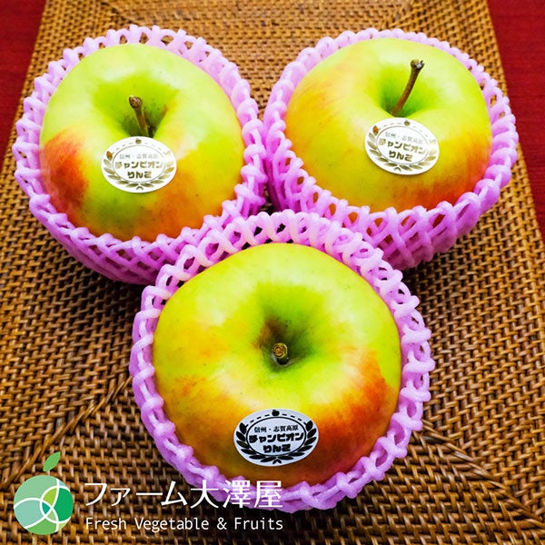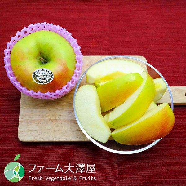 【ぐんま名月 志賀高原産チャンピオンりんご 特秀】 長野県の志賀高原で育った極上のぐんま名月です。高原特有の昼夜の寒暖差と清らかな水は、色づきがよく身のしまったおいしいりんごを育てます。 「チャンピオンりんご(R)」※は、ファーム大澤屋が選び抜いた最高品質のりんごにのみ与えられるブランド名(登録商標)です。当社が契約したりんご作りの名人である生産者が、まじめに、正直に、手塩にかけて育てました。 ※「チャンピオンりんご(R)」は株式会社大澤屋の登録商標です。(商標登録第6389916号) ぐんま名月は、パリッとした食感が特徴で、果汁も多くとてもジューシー。平均糖度は15度ほどで、コクのある甘さがあとをひきます。黄色いりんごとしては珍しく、蜜の入りやすい品種です。 ※蜜は天候・生育状況により入らない場合もございます。 果皮の地色は熟してくると黄緑色から黄色へと変化。日光がよく当たった場所はほんのりと赤色に染まります。 【最新の鮮度保持技術を使用し長期出荷】 ファーム大澤屋では収穫直後の新鮮なうちにスマートフレッシュ技術を使って貯蔵し、長期出荷にも取組んでいます。 スマートフレッシュ技術は、りんごの新しい鮮度保持技術です。りんごが老化するときに発生するエチレンガスを抑制しています。スマートフレッシュは環境にやさしく果実の表面や内部に残りません。 【保存方法】 保存する場合は、新聞紙で包んでからビニール袋に入れ、冷蔵庫の野菜室で保存するといいでしょう。 【ファーム大澤屋】 長野県産を中心とした、厳選された鮮度の高いフルーツや野菜のことならファーム大澤屋にお任せください。
