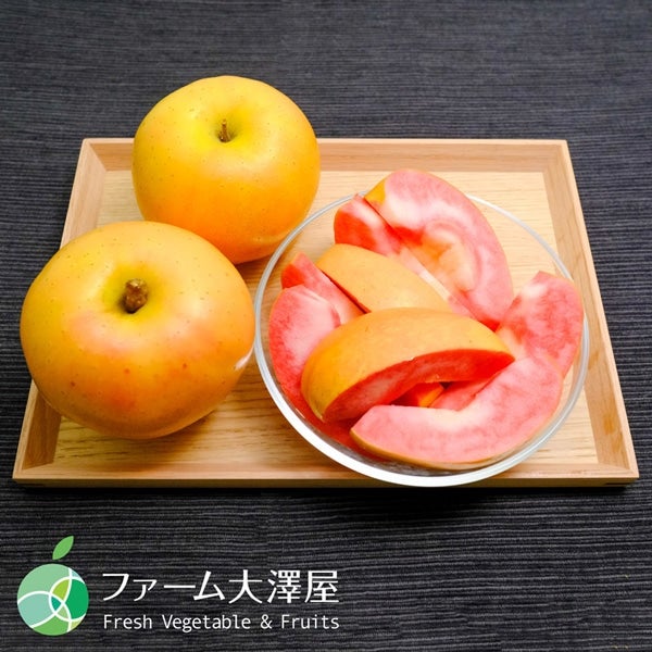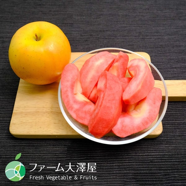 【なかののきらめき】 皮が黄色の王林と果肉の赤いいろどりを交配して誕生したりんごで、2018(平成30)年に品種登録されました。長野県中野市の生産者・吉家一雄さんが育成した品種で、最大の特徴は果肉が赤いこと。 香りが強くほどよく果汁があり、さくらんぼのようなさわやかな酸味があります。甘みもじゅうぶん感じられ酸味と調和して濃厚な味わいを堪能できます。 酸味がしっかりとあるので、加熱調理にも向いています。果肉が赤いためジャムにすると濃いピンク色の美しい仕上がりになります。 皮をむいて、くし形にカットして食べるのがオーソドックスですが、皮の部分にはポリフェノールなどが含まれているので、皮ごと食べることも意識しましょう。 【保存方法】 保存する場合は、新聞紙で包んでからビニール袋に入れ、冷蔵庫の野菜室で保存するといいでしょう。 【ファーム大澤屋】 長野県産を中心とした、厳選された鮮度の高いフルーツや野菜のことならファーム大澤屋にお任せください。