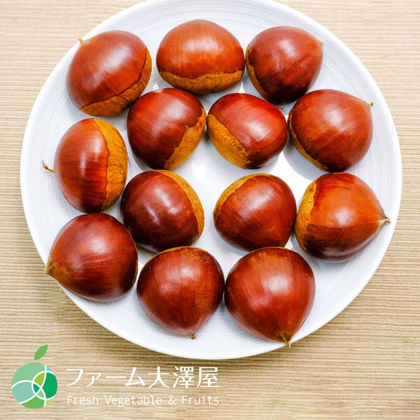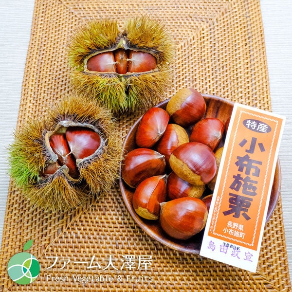 【小布施栗】 小布施栗(おぶせぐり)は、栗の町として有名な長野県小布施町で栽培されています。江戸時代には紀州みかんや甲州ぶどうと共に“徳川三大果”とうたわれて将軍家へ献上されていました。 小布施町で栗の栽培がはじまったのは、諸説ありますが室町時代からと言われています。昼夜の寒暖差が大きく水はけのいい酸性の土壌が、甘みが強く濃厚な味の栗を育てます。 ファーム大澤屋が厳選した小布施栗のこだわりは、おいしい栗を育てるためにさまざまな有機質肥料を使った土づくり。樹上で完熟し、自然に木から落ちた栗のみを収穫して出荷しています。 【保存方法】 商品到着後の常温保存は避けてください。水分が蒸発したり虫が発生する可能性が高くなります。調理するまで必ず冷蔵・冷凍で保管しお早めにお召し上がりください。 【ファーム大澤屋】 長野県産を中心とした、厳選された鮮度の高いフルーツや野菜のことならファーム大澤屋にお任せください。