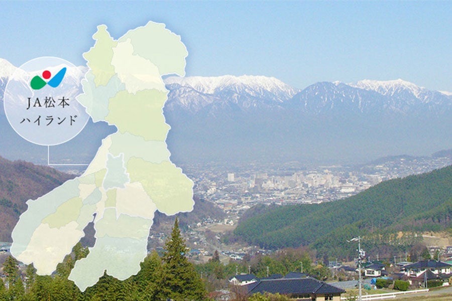 JA松本ハイランドは長野県のほぼ真ん中、北アルプスのふもと標高600m〜1000mの高原に位置します。年間の降水量は1,011mm、年平均気温は、11.2度と、さわやかな気候に恵まれた豊かな大地です。