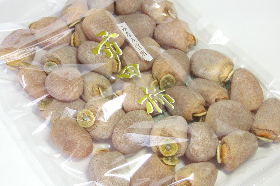 乾燥時の天候により、大きなシワのあるもの、粉が均一でないもの、少し硬めの市田柿が入る場合があります。