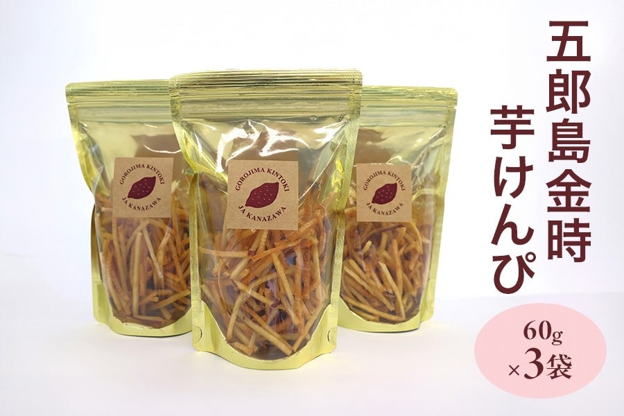 加賀野菜の五郎島金時を使用した芋けんぴです。味付けをしていないから素材そのものの旨みを感じられます。リニューアルをして、歯ごたえのある美味しい芋けんぴに仕上げました。 ぜひ一度、ご賞味ください。 五郎島金時芋けんぴを3袋セットにしお届けします。 ◆五郎島金時芋けんぴ◆ [原材料] さつま芋(石川県産)、植物油 [内容量] 60g [保存方法] 直射日光、高温多湿を避けて保存して下さい。 [賞味期間] 枠外下部に記載(製造日より4か月)