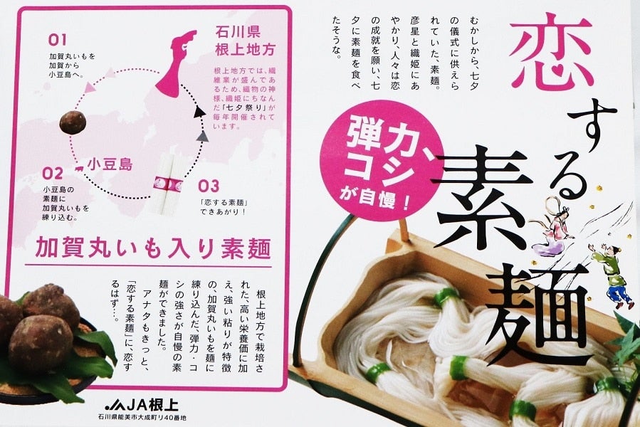 弾力・コシがあって滑らかな、「加賀丸いも」を練りこんだ素麺です。