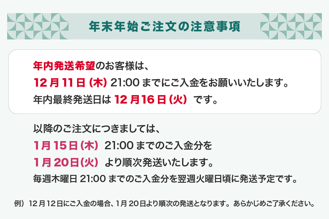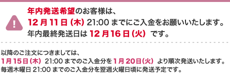 ※基本的に木曜日21時迄のご注文(コンビニ決済・ATM決済はご入金済)分を翌週火曜日〜木曜日に発送いたします。