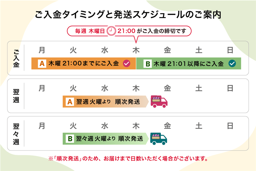 予めご案内させていただいている発送日・発送時期にそってお届けします。