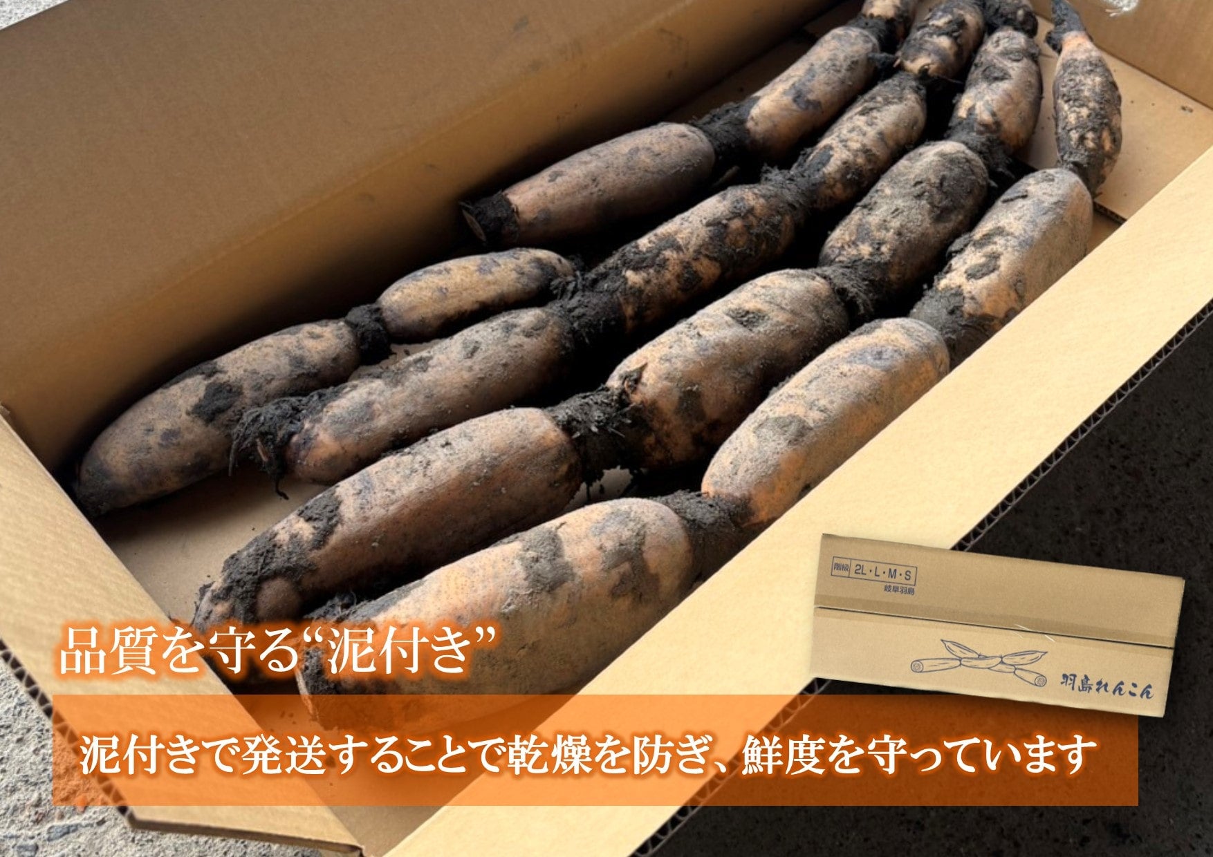 「羽島れんこん」は岐阜県羽島市の特産物です。 肉厚で柔らかくシャキシャキした歯ごたえをお楽しみいただけます。 栽培を行う羽島市は木曽川と長良川に囲まれ、レンコン栽培に適した湿田が広がっており、羽島市でれんこん栽培が始まって約150年の歴史があります。 収穫の際、泥の中のれんこんはどこに埋まっているのかすぐにはわからず、折らないよう慎重に手作業で収穫を行います。水を含んだ泥はとても重く収穫は大変な作業ですが、高品質のれんこんをお客様にお届けするため、手作業で収穫を行っています。また、「羽島れんこん」はお届けの方法にもこだわり、乾燥を防ぎ、鮮度を保つため泥付きのままお客様にお届けしています。 農家さんの思いの詰まった「羽島れんこん」をぜひお楽しみください。