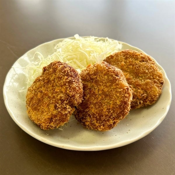【原材料名】ばれいしょ(国産)、牛肉(岐阜県産)、玉ねぎ、牛脂、乾燥マッシュポテト、粒状植物性たん白、発酵調味料、しょう油(大豆を含む)、バター、脱脂粉乳、食塩、昆布エキス、香辛料、衣(パン粉、小麦粉、植物油、粉末状植物性たん白、コーンフラワー、でん粉、食塩、脱脂粉乳)/調味料(アミノ酸等)