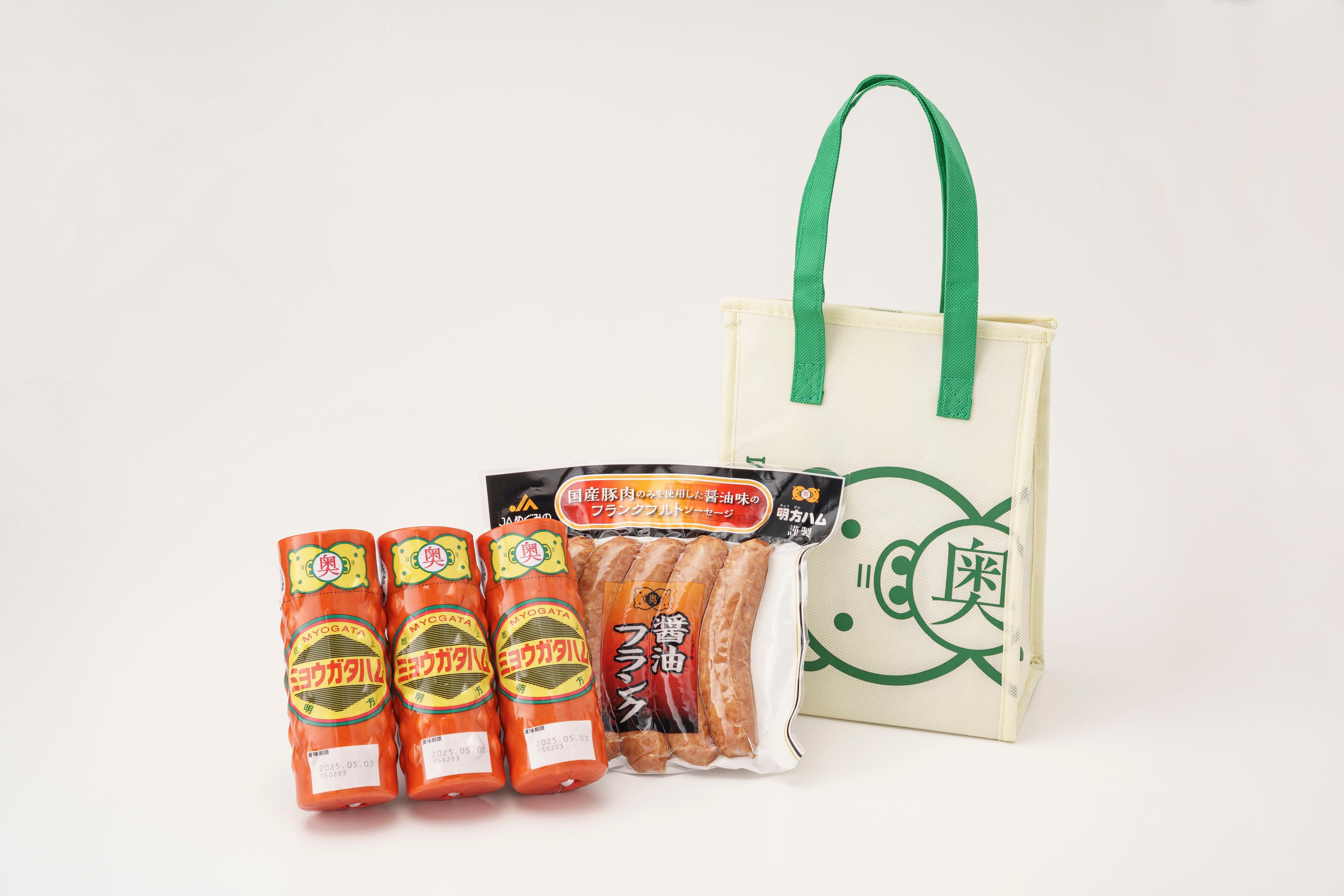 明方ハム保冷バッグセット(ミョウガタハム3本、醤油フランク5本入1袋)【国消国産キャンペーン】