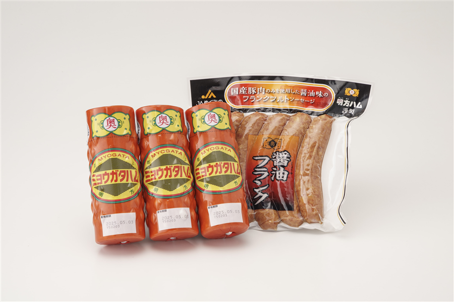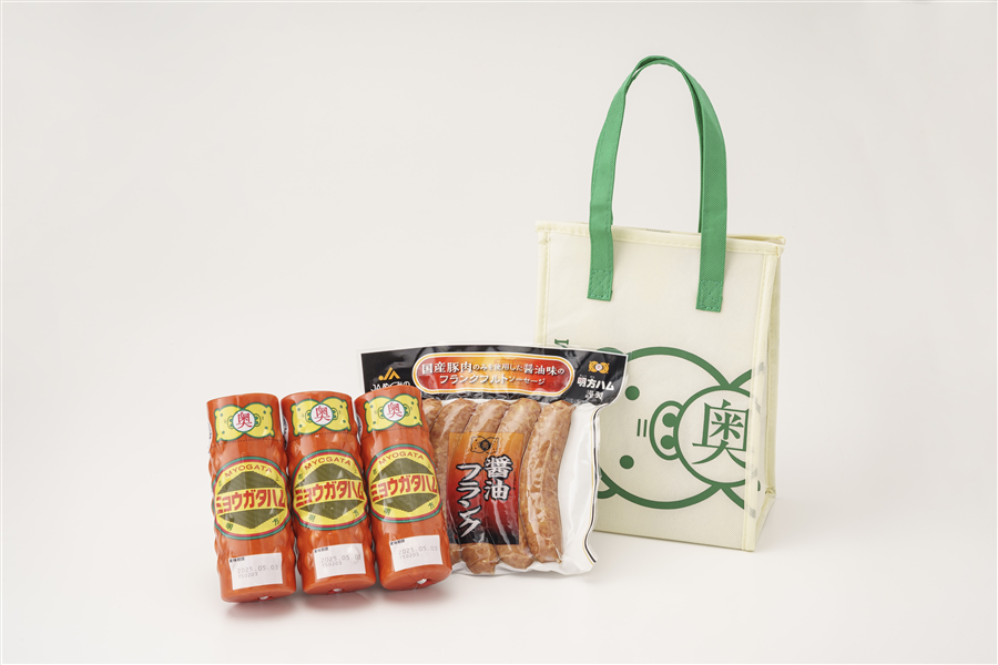 明方ハム保冷バッグセット 「ミョウガタハム3本、醤油フランク5本入1袋」