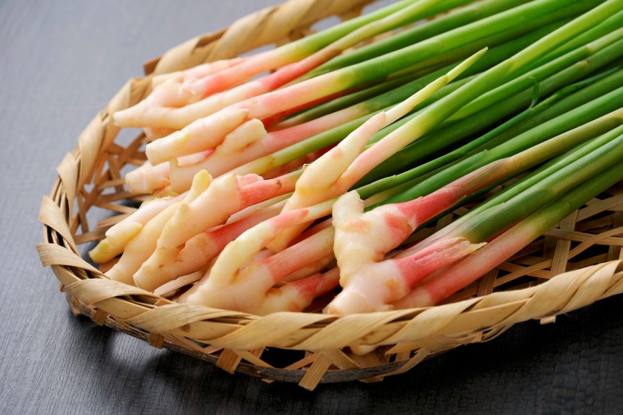 高級葉しょうがとして知られており、茎の付け根のところに鮮やかな紅がのっているその姿は、
