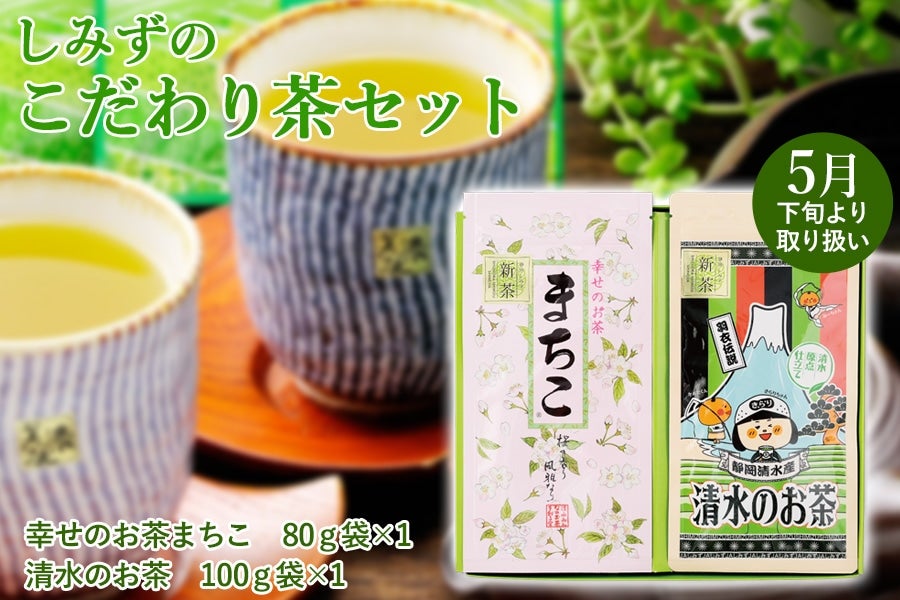 静岡しみず産 新茶ギフト  「しみずのこだわり茶セット」 世界緑茶コンテスト2009最高金賞受賞! 桜葉の香味が特長の「まちこ」と、 厳密な品質管理をクリアした 茶葉のみを使用した「清水のお茶」の こだわりのお茶セットです。 幸せのお茶まちこ80g袋×1 清水のお茶100g袋×1