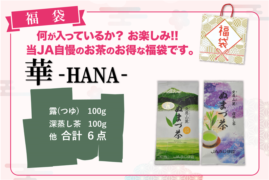 沼津のおいしいお茶をぜいたくに詰め込んだスペシャルな福袋です!! 気軽にお茶を楽しめる内容になります!! 一点づつの購入よりもお得です!! 【セット内容】 ・ぬまづ茶 露(100g) ・深蒸し茶(100g) ほか4点 (計6点) 【原材料名】 茶 【保存方法】 高温多湿をさけ、移り香に注意して下さい。 【賞味期限】 製造から12か月 ※パッケージデザインは変更となる場合があります。 ※写真はイメージです。 ※お届け日のご指定はできかねます。 ※金額のわかる領収書、納品書等は同封いたしません。 ※代引き決済はご利用いただけません。 ※のし・包装対応はしておりません。