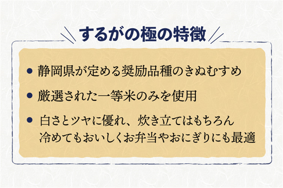 するがの極は、JAふじ伊豆なんすん地区本部を中心に生産されているお米で、水・肥料・農薬を徹底管理し、厳選された一等米のみを使用しています。