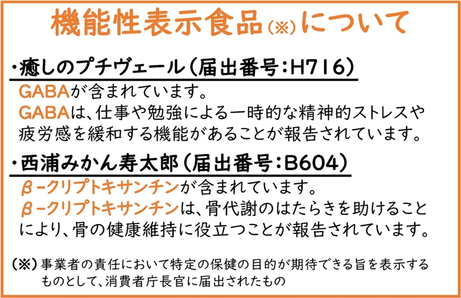「癒しのプチヴェール(R)」にはGABAが含まれ、GABAには、仕事や勉強による一時的な精神的なストレスや疲労感を緩和する機能があることが報告されています。本品を50g食べると機能性が報告されている1日当たりの機能性関与成分(GABA)の量の50%を摂取できます。