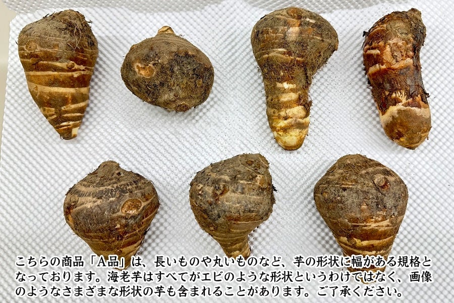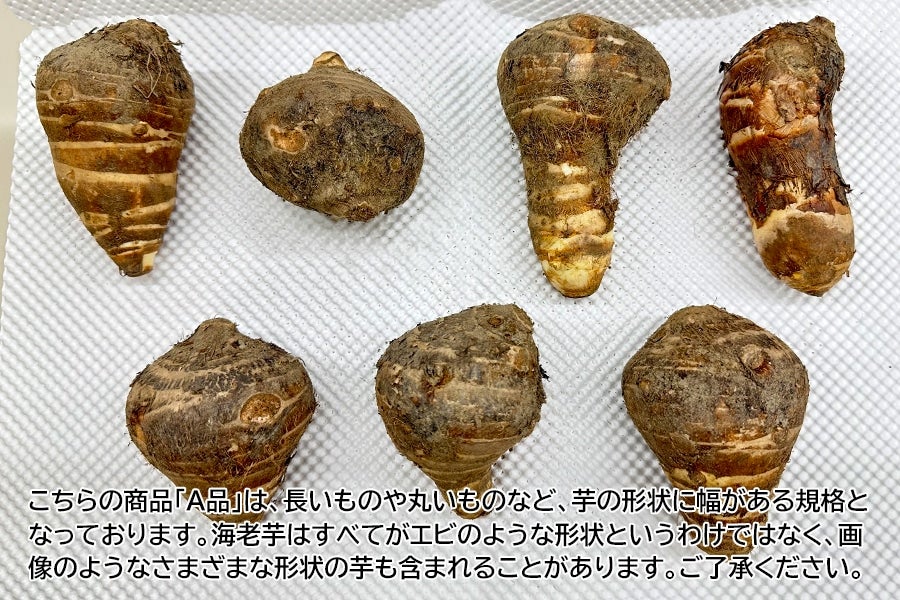 ※当商品の規格「A品」は、長いものや丸いものなど、芋の形状に幅がある規格となっております。海老芋はすべてがエビのような形状というわけではなく、画像のようなさまざまな形状の芋も含まれることがあります。ご了承ください。