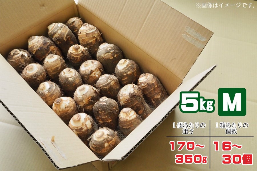 こちらの商品は、A品Mサイズの海老芋約5kgを段ボール箱に詰めてお届けします。(「A品」は、長いものや丸いものなど、芋の形状に幅がある規格となっております。)
