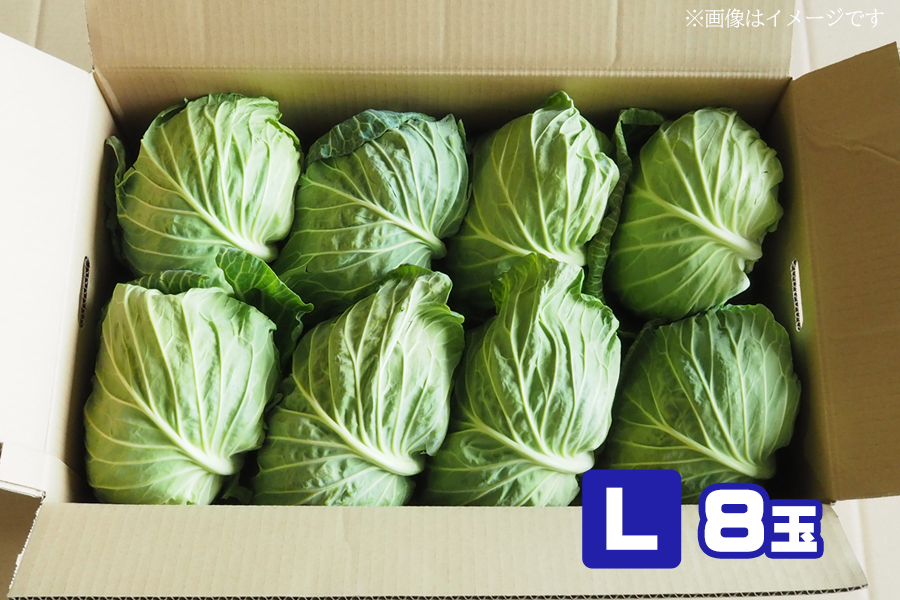 こちらの商品は、Lサイズのキャベツ8玉を段ボール箱に詰めてお届けします。キャベツ1玉の大きさは、直径約18cmが目安です。