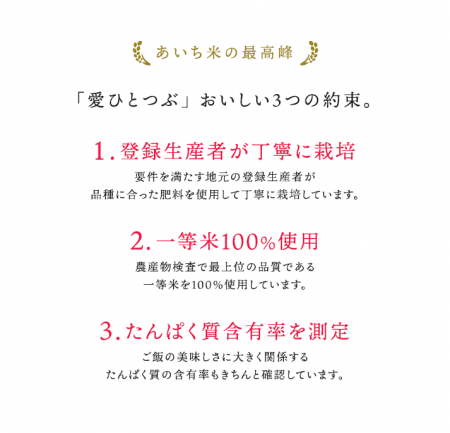 愛知県の銘柄米として開発した品種「なつきらり」の中でも、独自の厳しい品質基準をクリアした選りすぐりを「愛ひとつぶ」として販売しております。