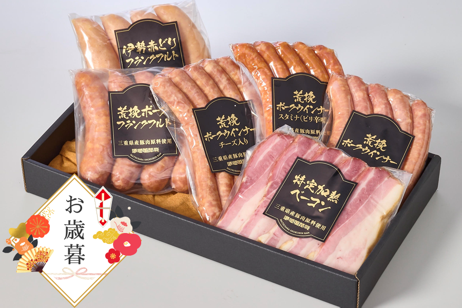 ● 内 容 ・荒挽きポークウインナー(プレーン) 150g ・荒挽きポークウインナー(スタミナ) 150g ・荒挽きポークウインナー(チーズ) 150g ・特定加熱ベーコン カット 160g ・ポークフランクフルト 200g ・伊勢赤どりフランクフルト 200g