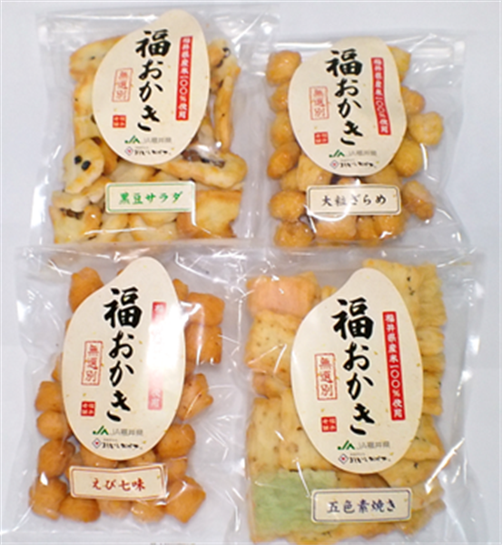 福井県産もち米を使用したおかきを製造している、株式会社吉村甘露堂に製造を委託。原材料にこだわった「福おかき」は4品目あり、それぞれに特徴があります。