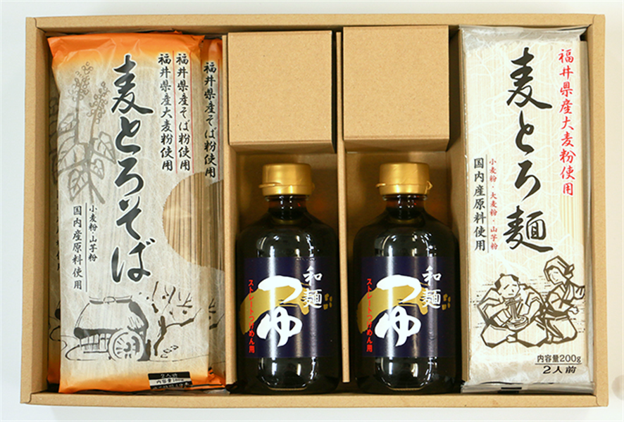 【原材料】小麦粉(国内産)、そば粉(福井県産)、大麦粉(福井県産)、小麦たんぱく、山芋粉(国内産)、食塩