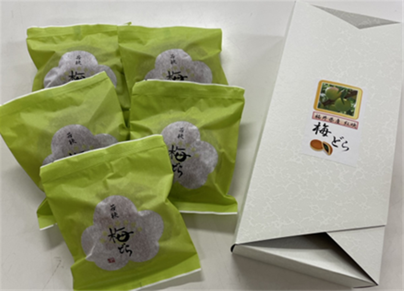 紅映(べにさし)梅の甘露煮の果肉入りの梅どらやきです。