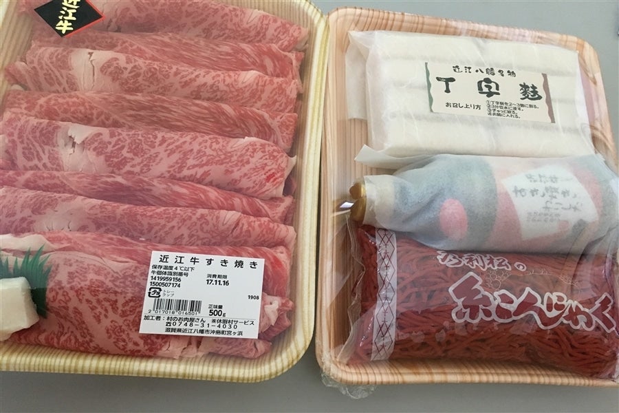 【 近江牛ギフト 人気ナンバー1商品です 】◆ お肉と割り下に近江八幡名物の赤こんにゃくと丁子麩が入ったセットです。