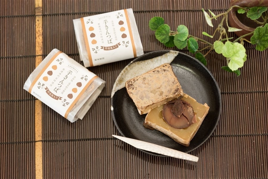京都府産「丹波くり」の渋皮煮が半個分ごろっと入った「丹波くり入」と、生地に宇治抹茶を練り込んだ「宇治抹茶入り」の2つのおいしさを楽しめる芋きんつばのセットです。