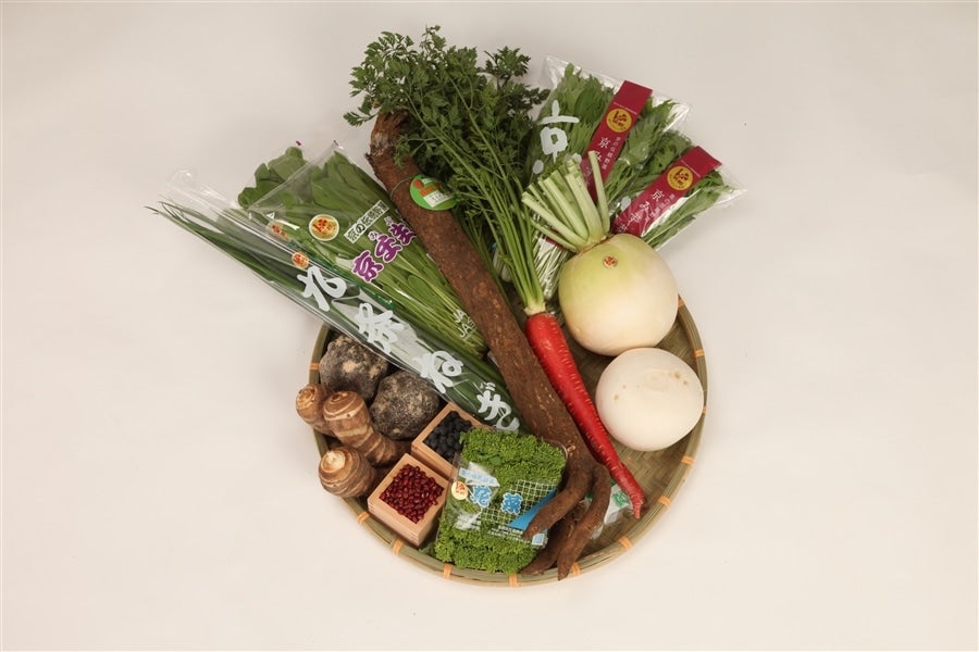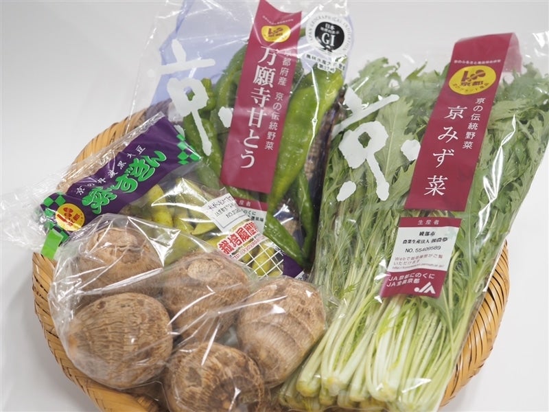 九条ねぎ、京みず菜、京壬生菜、小松菜、賀茂なす、万願寺とうがらし(万願寺甘とう)、伏見とうがらし、京おくら、丹波くり(10月中旬まで)、なす、京山科なす(10月末まで)、とまと、きゅうり、ごぼ丹、紫ずきん(10月末まで)、やまのいも、京かんざし、しゅんぎく、京こかぶ、ミニトマト(アイコ)、堀川ごぼう、京きゃろっと、えびいも、こえびちゃん、バターナッツカボチャ、菊芋、キャベツ、ブロッコリー、ゆずなど