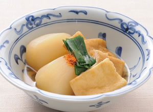 大きく丸い聖護院だいこんは、元は長大根だったとか。文政年間(1818〜1830年)に、尾張の国から奉納された大根を、京都の篤農家が聖護院辺りで栽培するうちに、丸い大根になりました。辛みがなくほんのり甘味さえある聖護院だいこんは、長時間炊いても煮崩れせず、とろけるような味わいになるのが特徴です。 千本今出川から少し西に行ったところにある千本釈迦堂では、12月7・8日には、毎年中風除けを祈願しての大根焚が行われます。アツアツのとろけるような聖護院だいこんの味わいは、1年も2年も寿命を延ばしてくれるようだと、毎年長い行列が絶えません。
