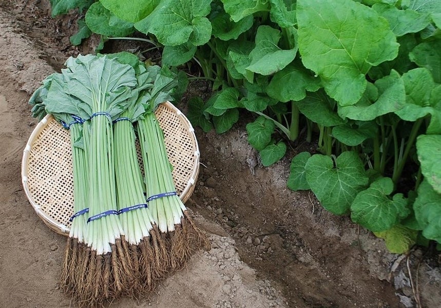 9月中旬から下旬に種をまき、秋の間に十分生育させます。秋に大きくなったものは、筋が多く硬いため食用にはせず、厳冬期に霜に当て、枯れた葉や軸をいったん刈り取ったあと、温かくなって再び芽吹いた柔らかいものを収穫します。収穫・出荷作業は、ハウス栽培のものが1月下旬から2月まで、トンネル栽培のものが2月から3月まで、露地ものは3月から4月初旬頃まで続きます。(天候により前後することがあります)